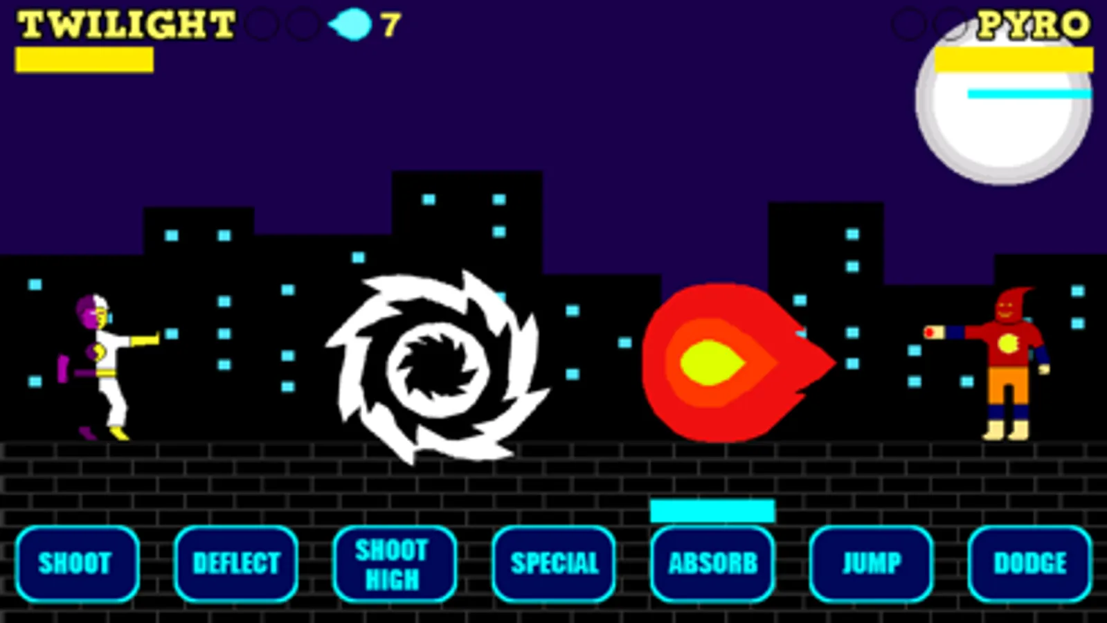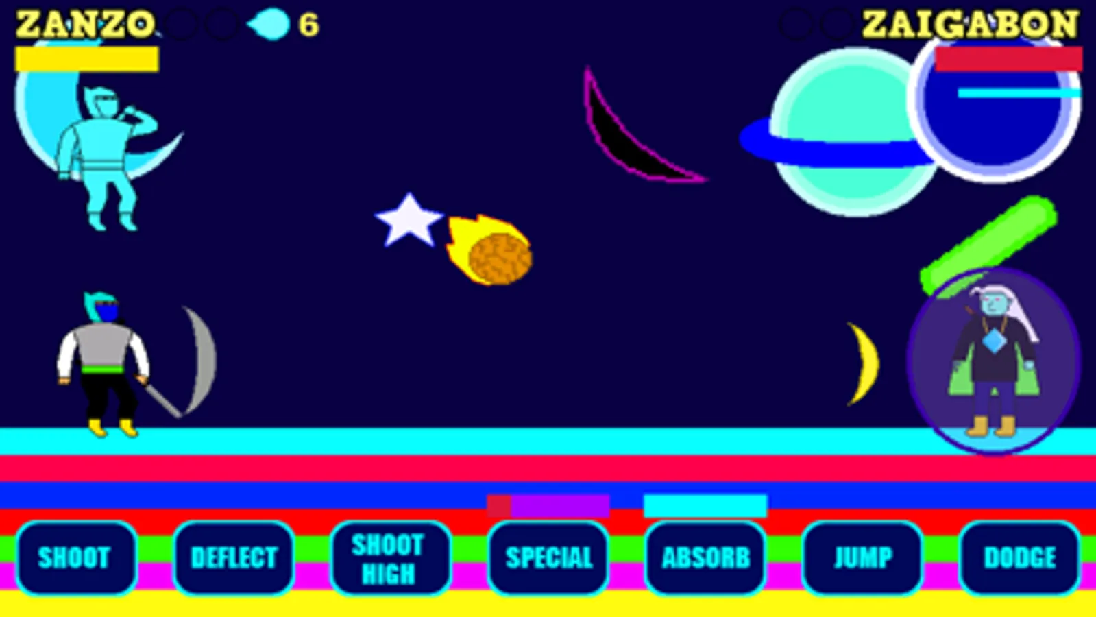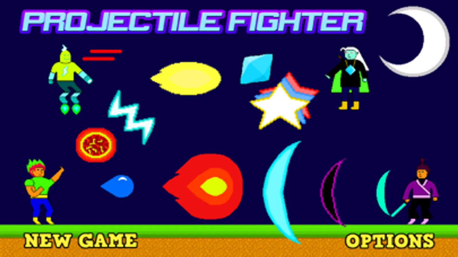 Projectile Fighter is a challenging arcade game where you can choose from a large variety of unique characters with multiple abilities to fight against a gauntlet of characters in a battle of projectiles. Projectile Fighter is like a fighting game but mainly projectiles are used to determine the outcome of a match. Projectile fighters can use a variety of elements for projectiles including light, dark, wind, magma, earth, lightning, aqua, fire, ice, plant and unique. Unique would apply to any projectile that does not fall under any of the other elements. All elements with the exception of unique have a weakness(an element they are weak to) and a counter(an element they counter). All characters have an affinity/element that determines their strongest element, elements they are resistant to and elements they can absorb. Projectile fighters can use basic techniques to attack by throwing projectiles in various directions(horizontally or diagonally upwards while standing and diagonally downwards while jumping) and they can defend themselves by deflecting, dodging jumping over and/or absorbing projectiles. Projectile fighters can also use a long list of special techniques for attacking, defending or powering themselves up. All characters are capable of using any technique but they are most likely to use their favourite techniques. Read the in-game guide/manual to get more information about the mechanics, techniques and terminology associated with the game. Projectile Fighter includes music and features a soundtrack with 7 tracks. Various types of projectiles include light energy, dark vortex, tornado(wind), magma ball, meteor(earth), lightning bolt, aqua ball, fire ball, ice spike, leaf(plant), wood(plant), ki energy, diamond, energy beam, eye beam, shock wave, shuriken, twilight energy, twilight vortex and star. Various classes/types of characters include normal, android, mage, swordsman, ninja, hybrid, alien and deity. Various types of stages and what they consist of include... Light stage - a heavenly sky, clouds and a bright sun. Dark stage - a city at night with skyscrapers and a full or crescent moon. Wind stage - a meadow and a giant tornado. Magma stage - a volcano full of lava that constantly erupts. Earth stage - a rocky area with big mountains. Lightning stage - rain and lightning bolts. Aqua stage - a waterfall. Fire stage - blue flames. Ice stage - snow, an icy ground, mountain and pine trees. Plant stage - a green forest full of grass and trees. Unique stage - outer space, a rainbow ground, celestial bodies, planets, a blackhole, a moon, a sun and an abundance of stars. Projectile Fighter is a very hard game that requires good reflexes, reactions, patience and focus in order to succeed.