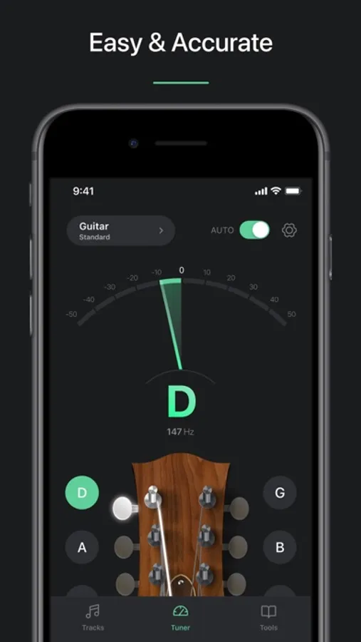 With Tuner, you can easily, quickly, and accurately tune your guitar, bass, or ukulele anywhere, anytime - all you need is your phone and your instrument. That’s all. You don’t need any other accessories to enjoy playing music! This app is perfect to learn how to tune your instrument quickly and whether you are a beginner, intermediate, or advanced, you can always choose the best mode for you: manual or automatic. Moreover, we provide you with a tuning range from Ab1 (51.91 Hz) to D5 (587.32 Hz)!