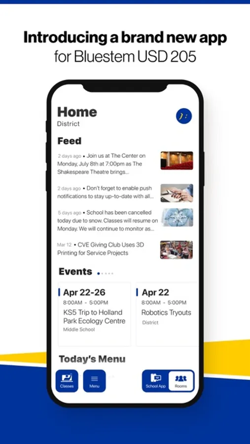 The event section shows a list of events throughout the district. Users can add an event to your calendar to share the event with friends and family with one tap.