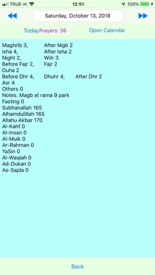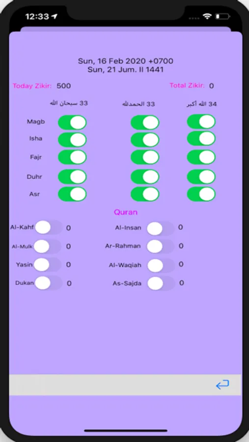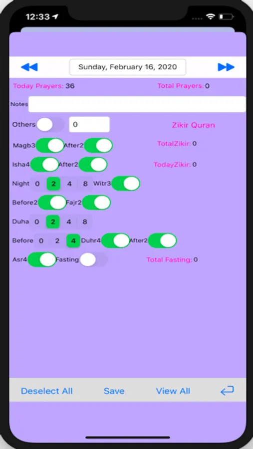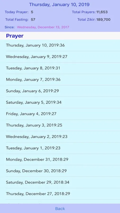 Logs total lifetime prayer, zikir, fasting, quran since the first day using app