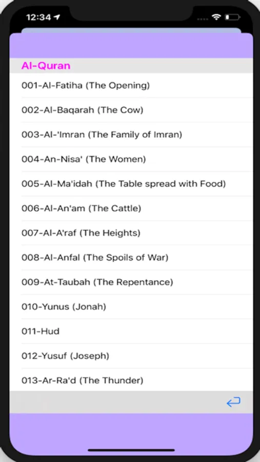 Tap Quran icon to display a table of Noble Quran from King Fahd Complex for the Printing of the Holy Qur'an with translation