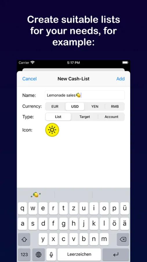 -The Account List: With the account list you can clearly document all your expenses and income. You can assign transactions to a category, repeat them automatically and then analyze the account and optimize your finances.