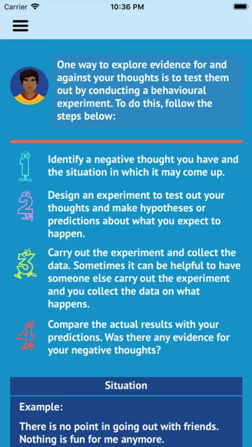 it may come up. You can then use the app to design an experiment (called a behavioural experiment) to test out your thoughts and make hypotheses or predictions about what you expect to happen. Once you carry out the experiment, you can use the app to collect and record the data. Finally, you can compare the actual results with your predictions. Was there any evidence for your negative thoughts?