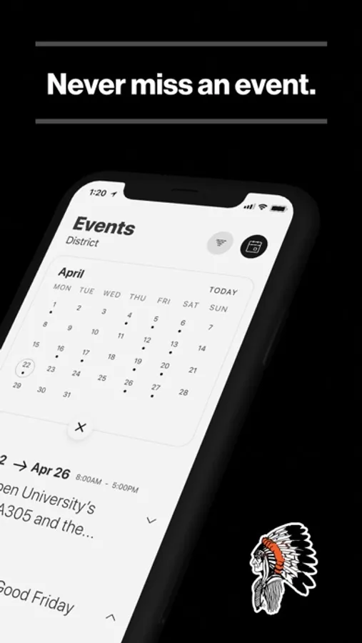 The event section shows a list of events throughout the district. Users can add an event to their calendar to share the event with friends and family with one tap.