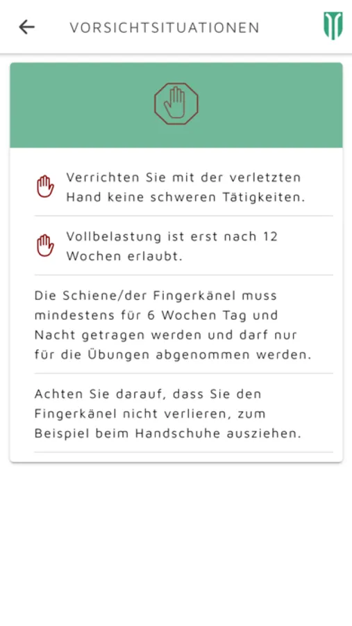 Diese App richtet sich an Patienten, die eine Verletzung der Beuge- oder Strecksehnen an der Hand haben. Sie darf angewendet werden bei: