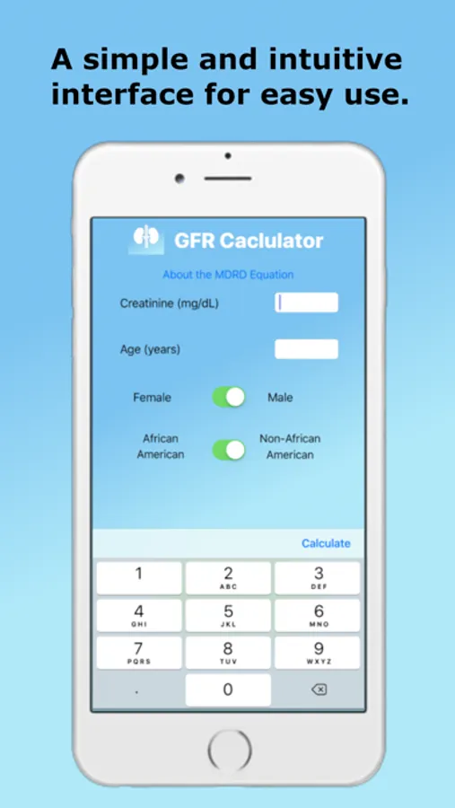 A simple, easy to use GFR calculator using the MDRD Study equation. Requires creatinine value (mg/dL), age, race and gender.