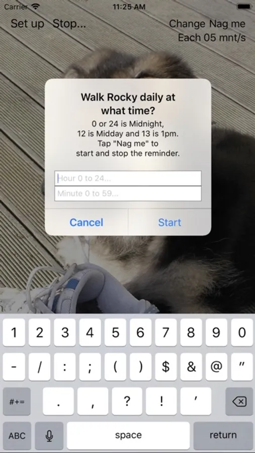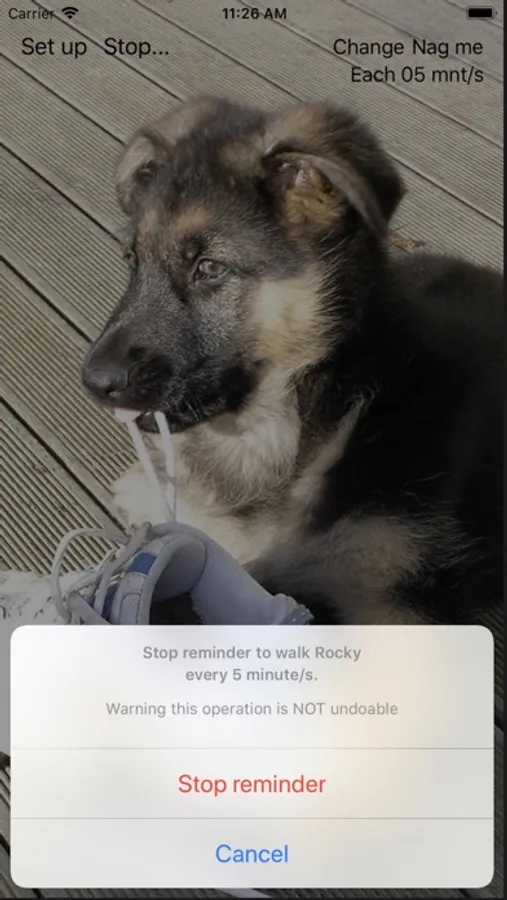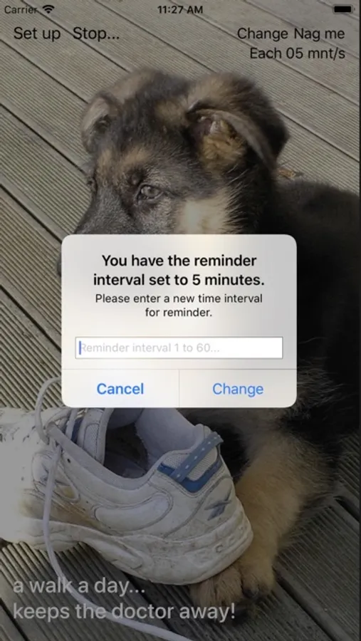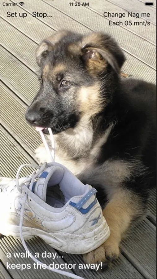 A walk a day prompts you to take a stroll with your dog every day at whatever time you choose. You can set as many daily notifications as you like and you can ask it to remind you later each time a notification is delivered, if you are not quite ready to go out. You can use it as an alarm by setting up a reminder that "nags you" at any interval between 1 and 60 minutes.