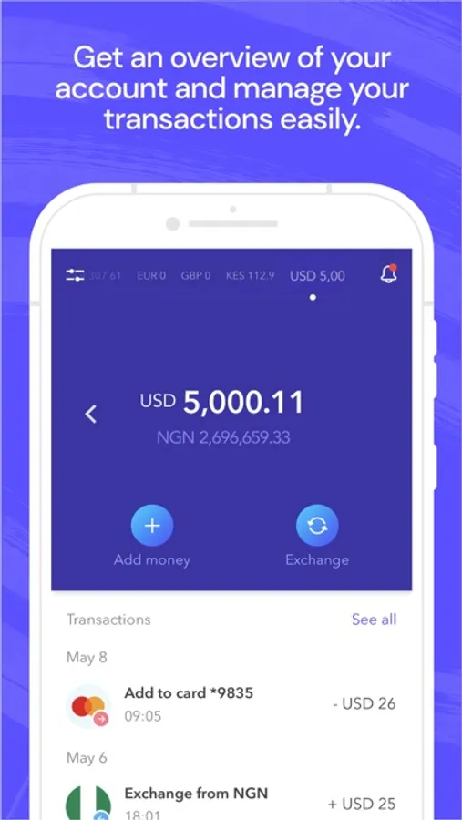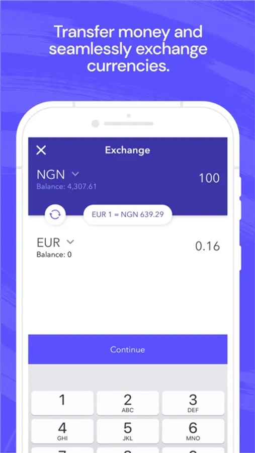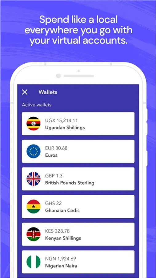 Hold and exchange six different currencies: GHC, KES, NGN, RWF, UGX & USD