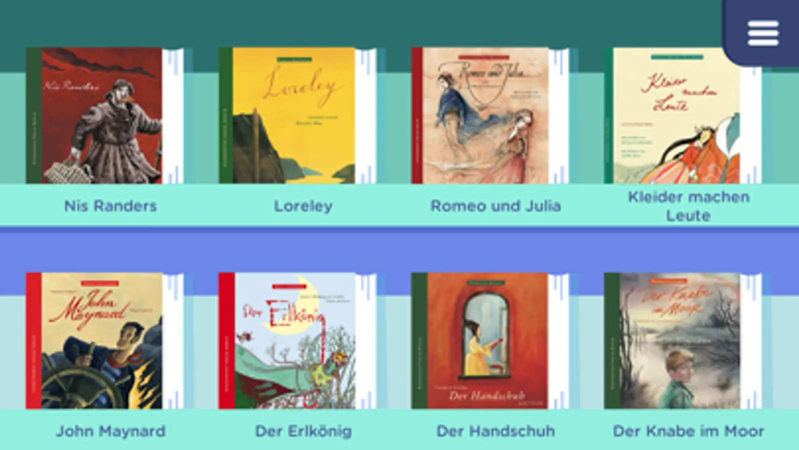 Erleben Sie gemeinsam mit Ihren Kindern eine Auswahl der schönsten Poesie- und Weltliteratur-Bände aus dem Kindermann Verlagsprogramm als animierte E-Books ab 4 Jahre – markant gelesen von bekannten Schauspielern und Hörbuchsprechern. So bekommen Kinder im Grundschulalter einen ersten Zugang zu Klassikern und Lust aufs Original wird geweckt. Goethe, Schiller oder Shakespeare werden zum Lese-Abenteuer! Mini-Spiele mit einigen unserer witzigsten Büchercharaktere dürfen natürlich auch nicht fehlen.