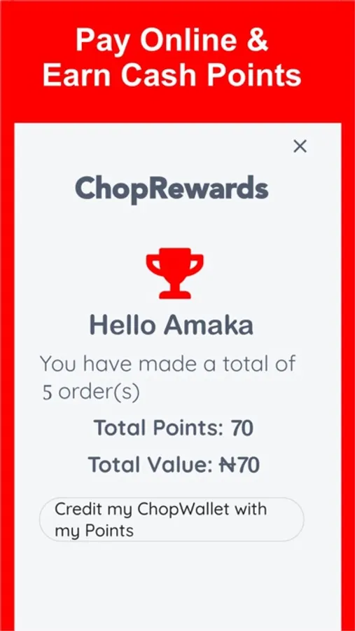 Get rewarded with Cash Points every time you order meals and make payments on the Chopnownow app or website. You can use your Cash Points to pay for subsequent orders.