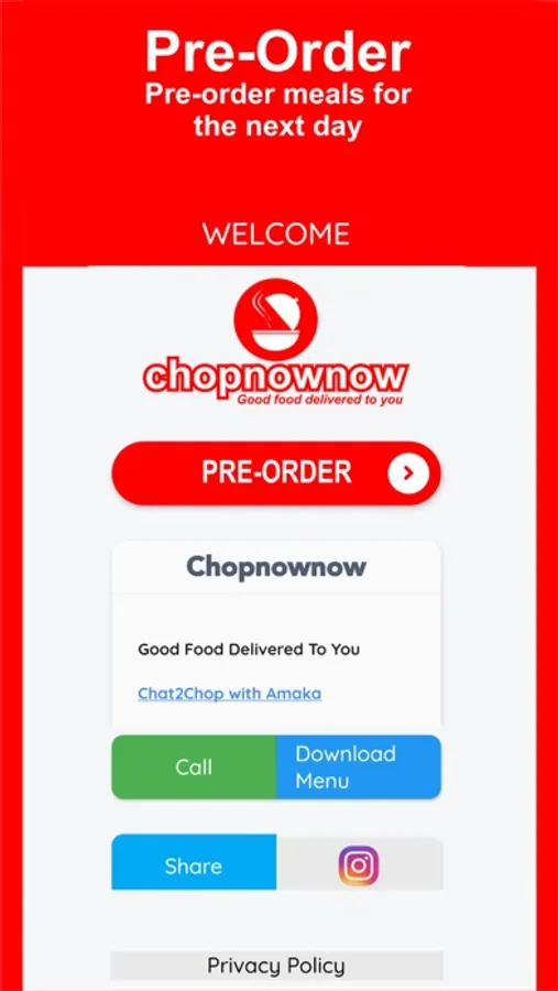 You can also order meals in seconds with our Chat2Chop with Amaka chatbot. Say "Hello" to Amaka in WhatsApp (08183761199) to start your order.