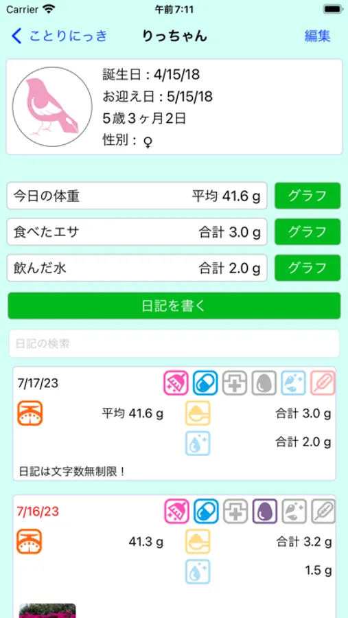 また、お世話やタマゴの記録、日記、写真といった様々な情報を鳥1羽ごとに管理できます。