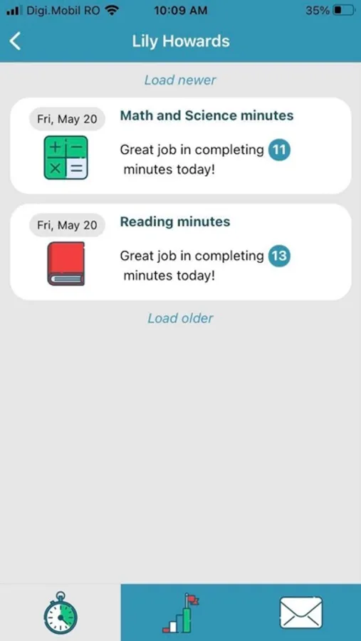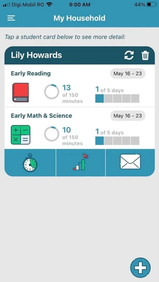 Parents can see the amount of time their student spends in Waterford Early Learning. The app breaks down the usage time by subject area and shows parents whether the child is on track for the week.