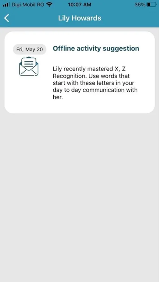 Parents receive messages from Waterford Early Learning, with suggestions about offline activities that they can engage into, with the child, based on the child's progress.