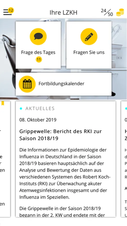 Die App bietet Informationen zu aktuellen Themen und Terminen, Hinweise auf Veranstaltungen, Wissenswertes zu Praxisführung, Abrechnung und rechtlichen Fragen aus den Fachabteilungen und ein Fachfragen-Quiz als Online-Fortbildung, mit dem Zahnärztinnen und Zahnärzte nicht nur ihr Wissen auffrischen, sondern auch Fortbildungspunkte sammeln können.