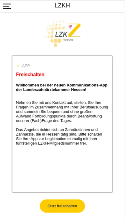 Hinweis: Die App wurde für Mitglieder der LZKH und ihre Bedürfnisse entwickelt. Beim Erststart ist daher eine Legitimation erforderlich. Nur in Hessen tätige Zahnärztinnen und Zahnärzte können sich für die App-Nutzung freischalten. Auch die Berechtigung der Nutzung unserer App ist an die Mitgliedschaft der Landeszahnärztekammer Hessen gebunden. Mit dem Wechsel in einen anderen Kammerbezirk erlischt die Berechtigung.