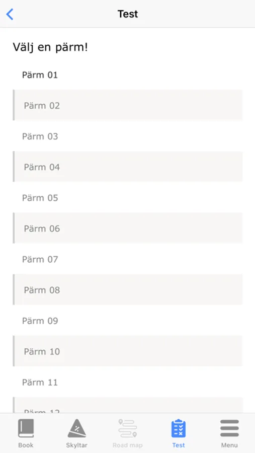 Börja med att öva dina kunskaper med olika pärmar för att sedan gå över till test. Du har tillgång till obegränsade antal tester. Efter varje test kan du se hur många procent rätt du fick så att du kan se hur utvecklingen fortskrider.