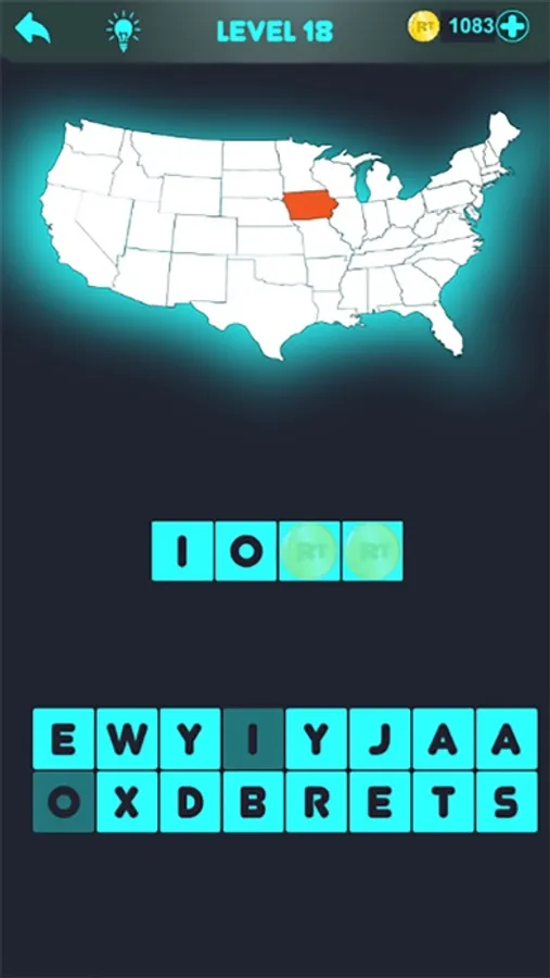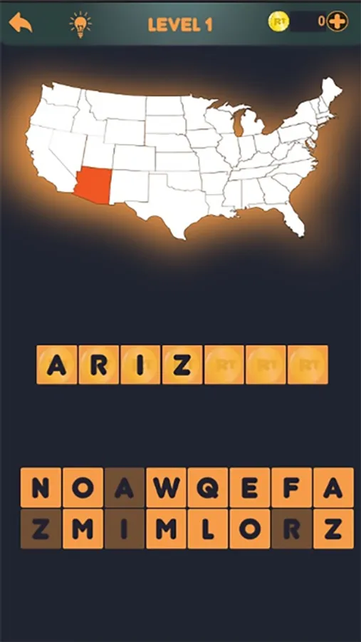 Quiz! Guess the state name by the location on a map and fill out the empty squares correctly. Collect the coins and spend them on hints.