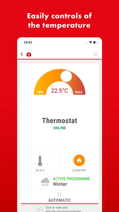 Manage the temperature in three different modes: manual, temporary manual or automatic. Turn your smartphone to configure the timer with six different customisable temperature bands: comfort +, comfort, night, economy +, stop/antifreeze.