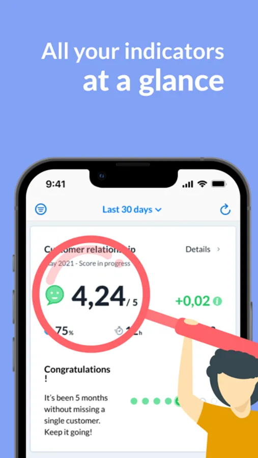 - Consult at anytime your indicators (NPS, customer relationship, customer satisfaction…) thanks to a clear and synthetic view of your different scores.