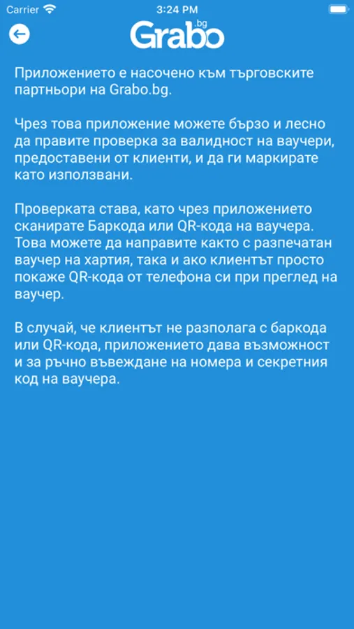 Чрез това приложение можете бързо и лесно да правите проверка за валидност на ваучери, предоставени от клиенти, и да ги маркирате като използвани.