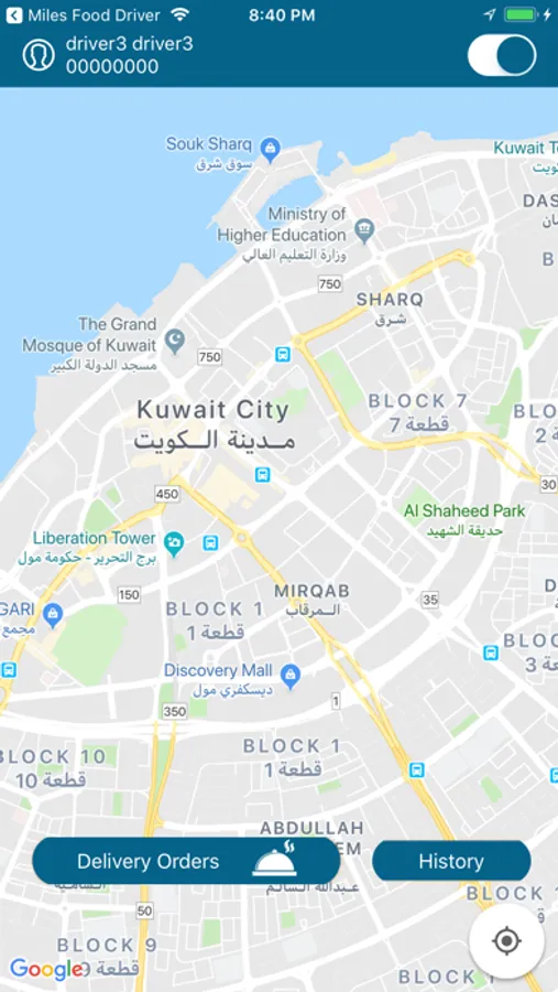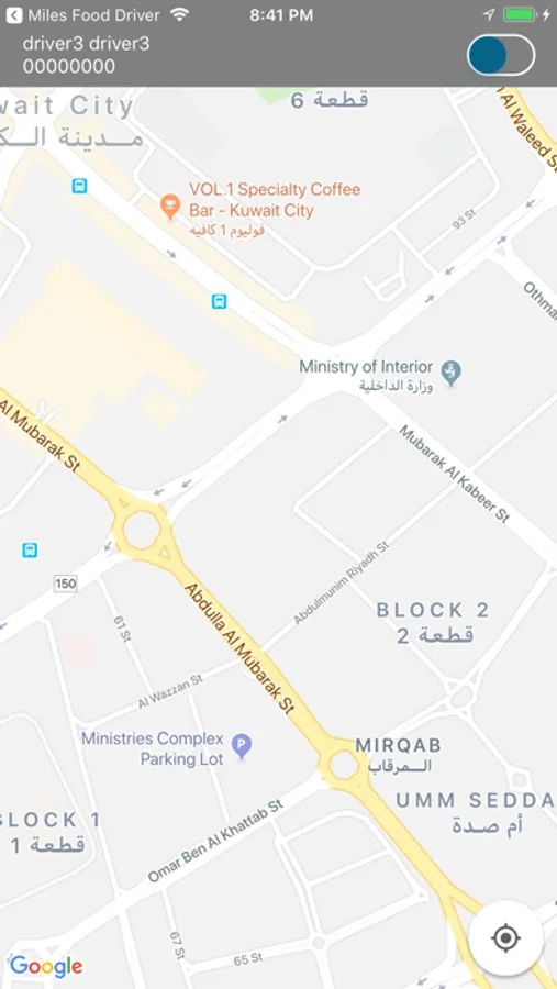 The driver (App user) is allowed to connect to Miles App by pressing “on” button which will enable the driver for delivering orders, also he can disconnect himself by pressing “off” button.