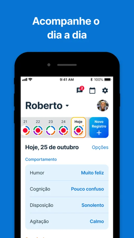 Cadastre a pessoa a ser cuidada, faça registros com agilidade e compartilhe o cuidado com familiares e cuidadores. Adicione também o plano de saúde para receber o suporte de profissionais através da Cori.