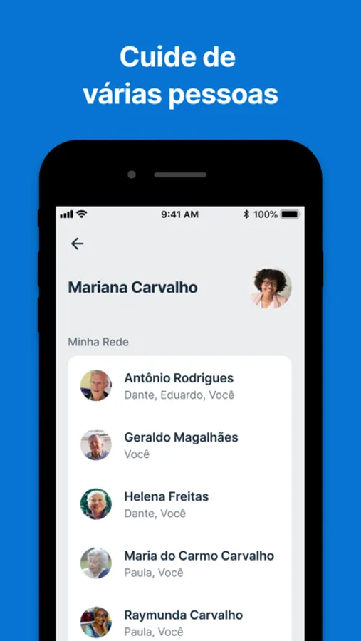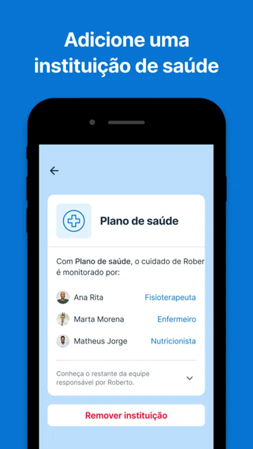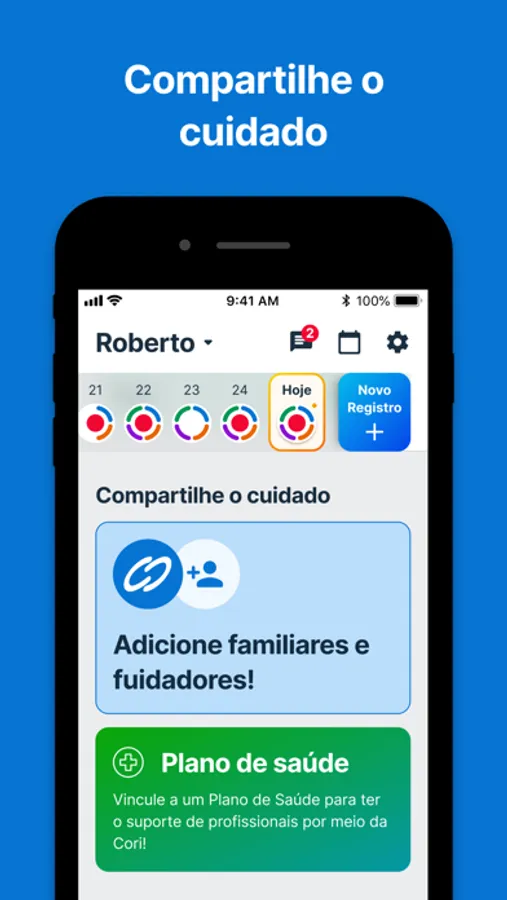 Cadastre uma pessoa a ser cuidada, faça registros com agilidade e compartilhe o cuidado com familiares e cuidadores. Adicione também o plano de saúde para receber o suporte de profissionais através da Cori.