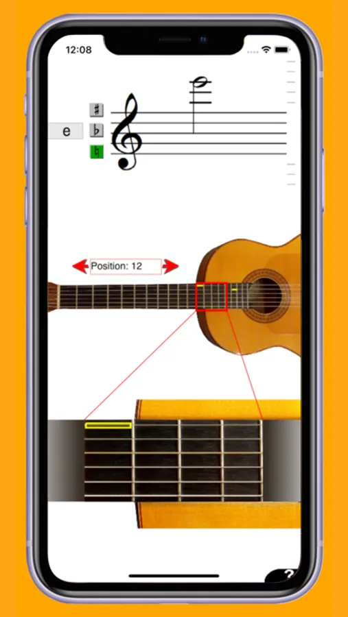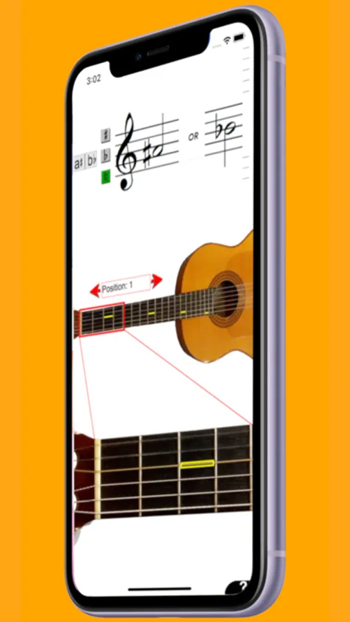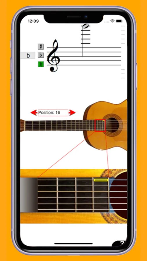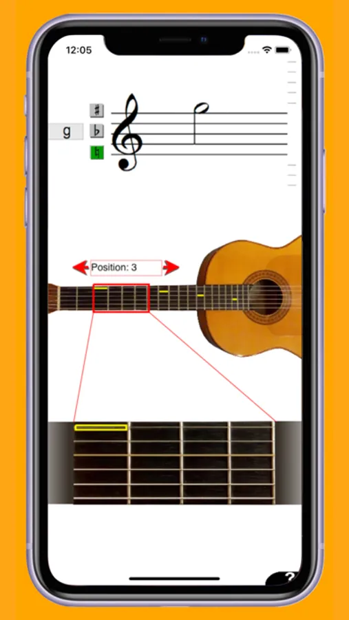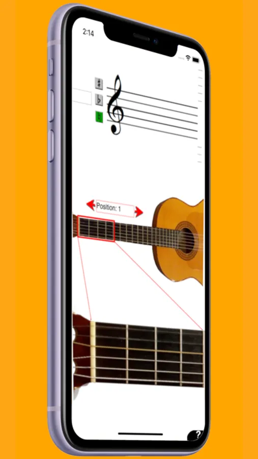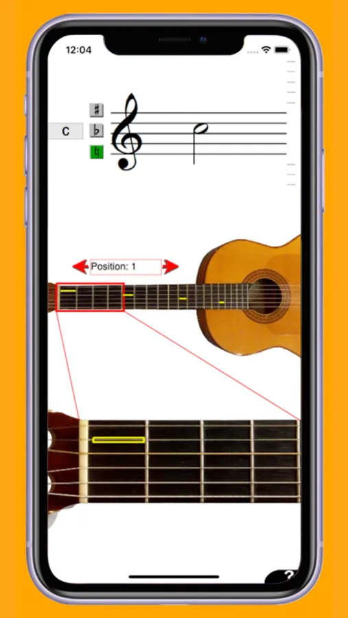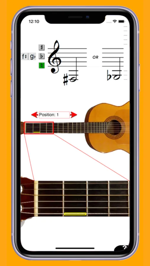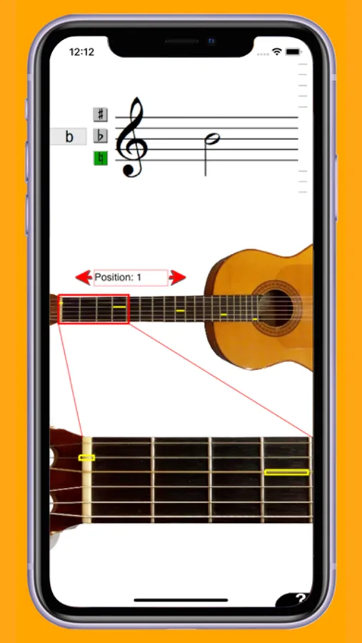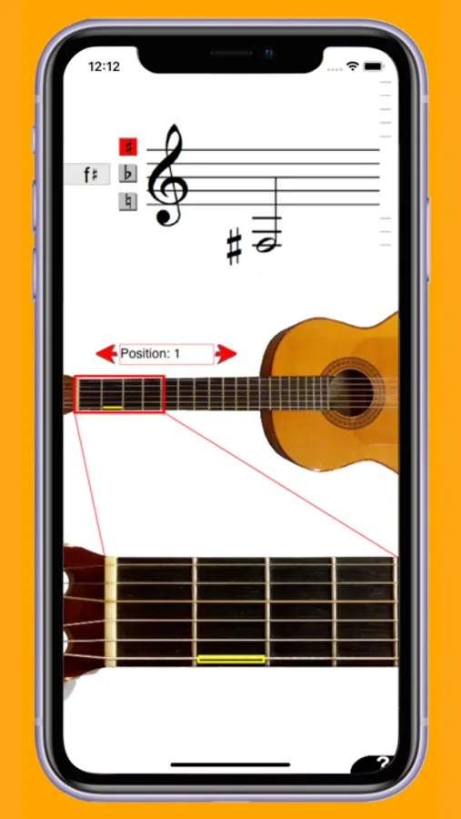 You can tap on a staff to see where on the guitar a certain note can be played. You will see this both on an overview picture of a guitar in the middle of the screen, and on a picture of an enlarged position of the guitar.