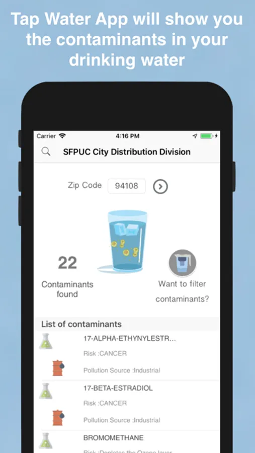 Tap water App your guide to safe drinking water. Reduce your exposure to common drinking water contaminants. Since 2010, water utilities testing has found pollutants in our(US) tap water, with over 29 million records of drinking water quality records.