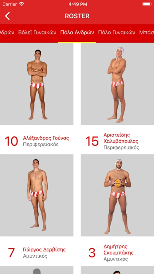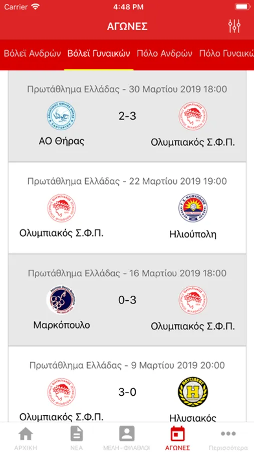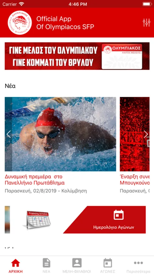 - Δες το πρόγραμμα όλων των αγωνιστικών τμημάτων (Βόλεϊ Ανδρών, Βόλεϊ Γυναικών, Πόλο Ανδρών, Πόλο Γυναικών, Χάντμπολ Ανδρών, Μπάσκετ Γυναικών). Έλεγξε τις ημερομηνίες και την ώρα έναρξης για τα επόμενα παιχνίδια και ενεργοποίησε τις ειδοποιήσεις ώθησης για να λαμβάνεις τις σχετικές ενημερώσεις!