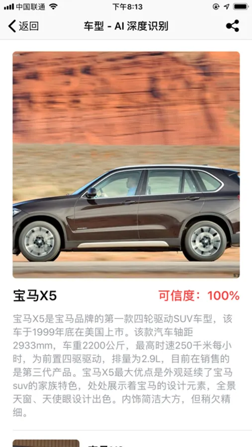 【车型】用于检测一张车辆图片的具体车型。即用户拍摄一张车辆图片,立即可得到图片的车辆品牌及型号。