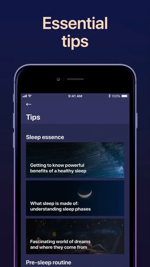 Get an all-in-one solution for sleep problems and change your mornings forever! Follow your personal recommendations with Sleep Coach and fall asleep faster with ASMRs, calming sounds or sleep stories.