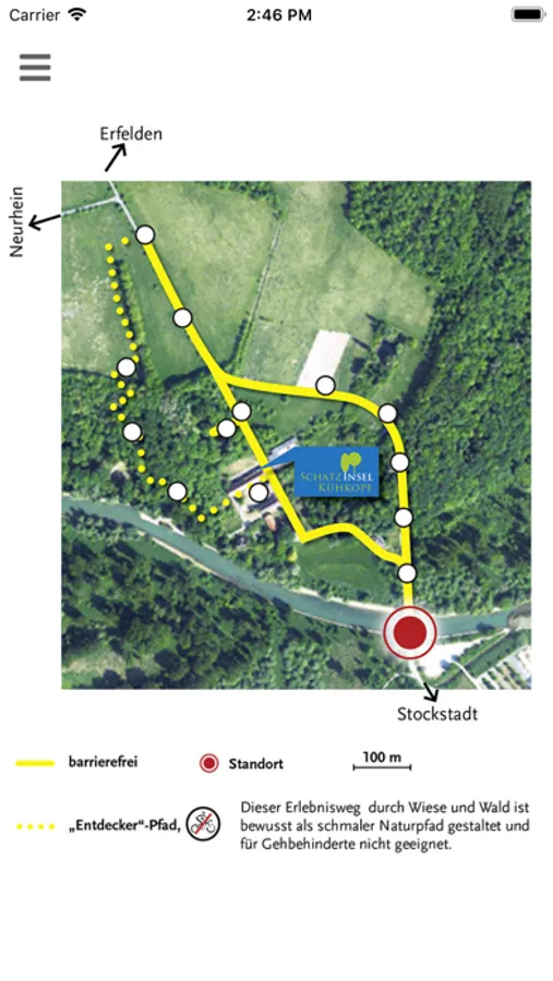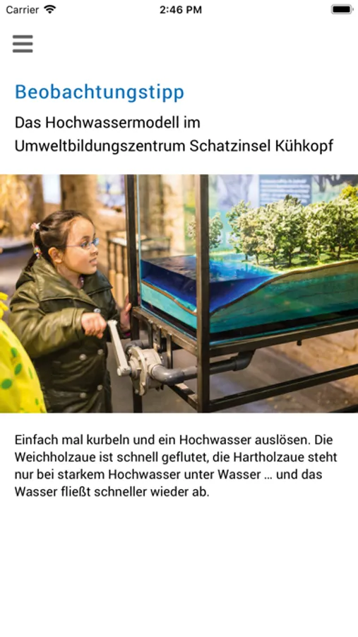 Die App „Draußen im Fluss“ ist ein Angebot des Umweltbildungszentrums Schatzinsel Kühkopf, in Hessens größtem Naturschutzgebiet „Kühkopf-Knoblochsaue“ in der Rheinaue bei Darmstadt auf Entdeckungsreise zu gehen. Die Reise führt mittels QR-Codes über einen Erlebnispfad von weniger als einer Stunde Dauer mitten durch die einmalige Flusslandschaft. Weitere Informationen verstecken sich auch in den Ausstellungen des Umweltbildungszentrums im Hofgut Guntershausen.