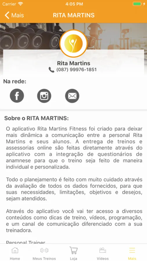 O aplicativo Rita Martins Fitness foi criado para deixar mais dinâmica a comunicação entre a personal Rita Martins e seus alunos. A entrega de treinos e assessorias online são feitas diretamente através do aplicativo com a integração de questionários de anamnese para que o treino seja feito de maneira individual e personalizada.