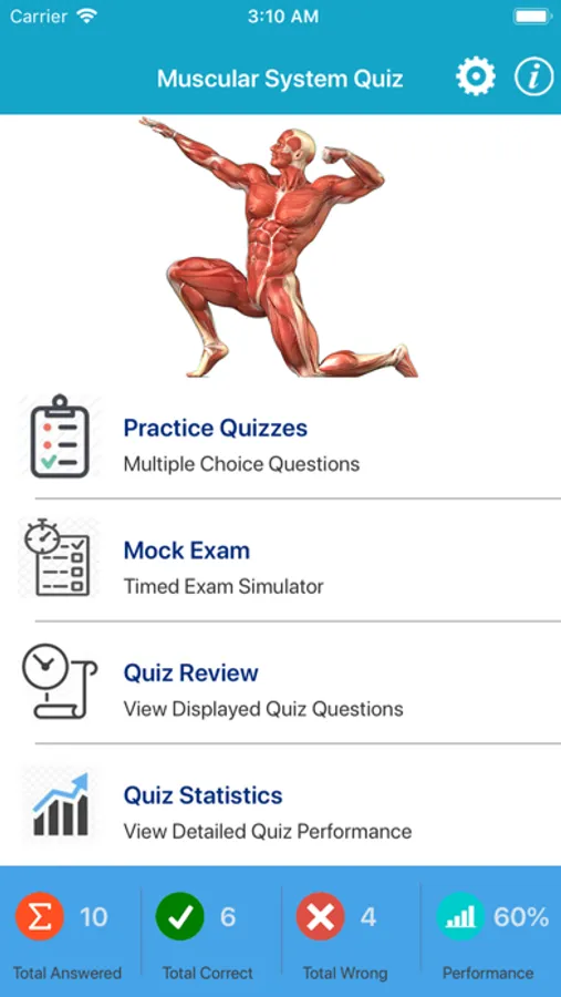 There are 2 quiz mode. One of quiz include at the following muscular system topics.