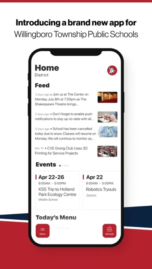 The event section shows a list of events throughout the district. Users can add an event to their calendar to share the event with friends and family with one tap.