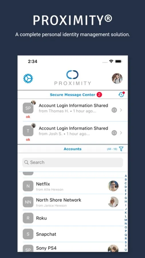 Build your PROXIMITY® network of trusted contacts. Securely share login information, including authenticator one-time passcodes (OTP). Each individual PROXIMITY® user will decide what is shared and what remains personal and private.