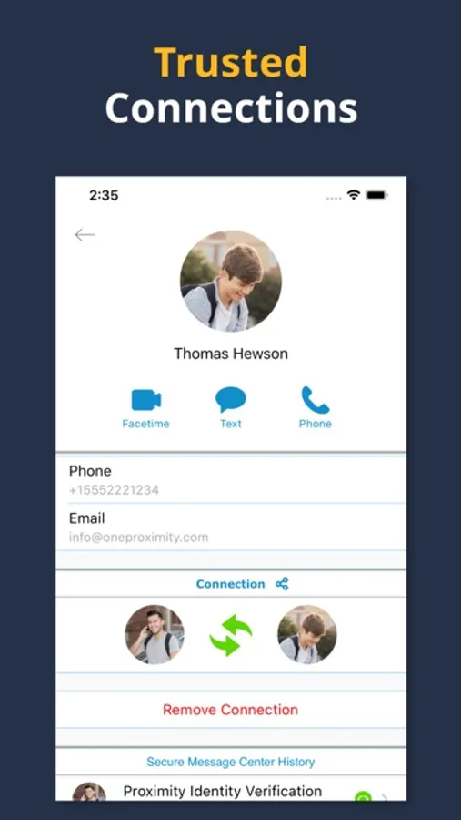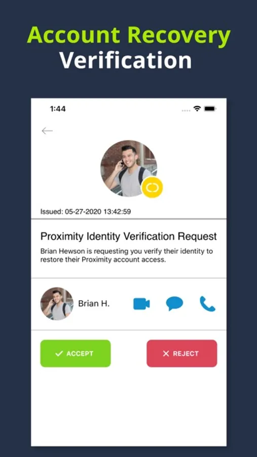 Your data is only accessible on one singular device, registered and controlled by you. Your PROXIMITY® trusted connection network is your recovery system. Lost device? New device? Deleted App? No problem! Simply download the PROXIMITY® app on your new device, verify your mobile number, and choose one of your trusted PROXIMITY® contacts to verify your identity and pass you back an encrypted copy of the only key to your account. By design, we cannot access your data and cannot help you recover your account.