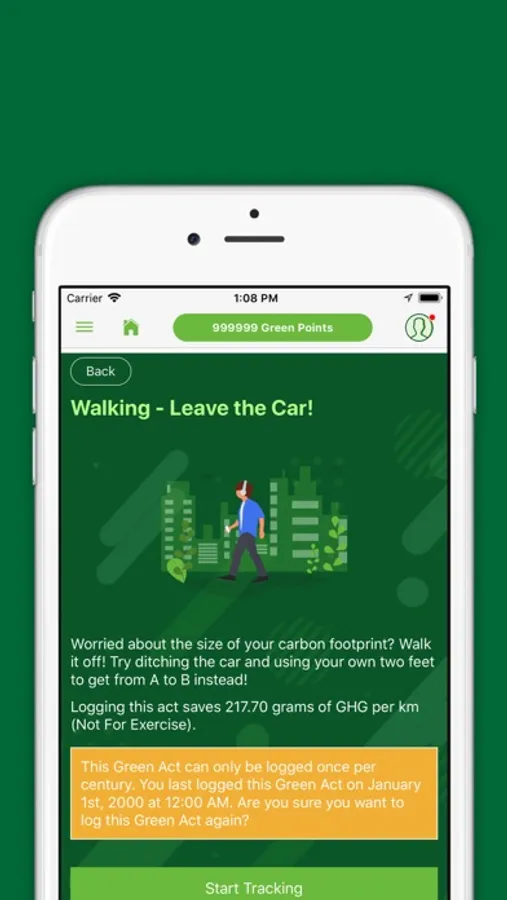 Our app will quantify the amount of greenhouse gas emissions reduced by each Act of Green.