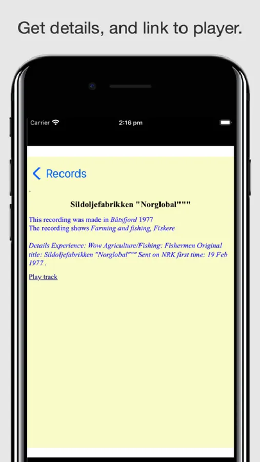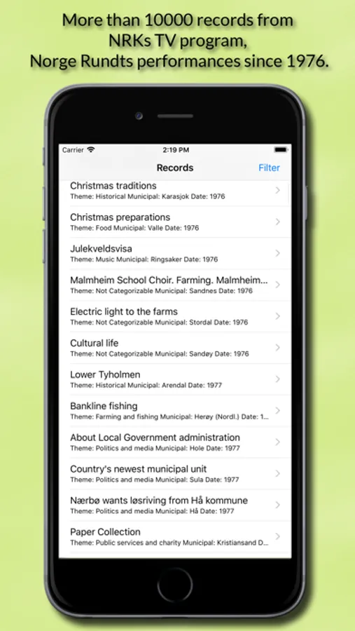 The app provides data categorized by many phenomena, by time, place and topic. You can browse over 10,000 records, each providing a click-bar link so you can play the video clip on your iPhone or iPad. Send it to yourself or friends as an email if you like watching the TV show on another medium. With a super fast and dynamic filter, you quickly find elements from the Norwegian story.