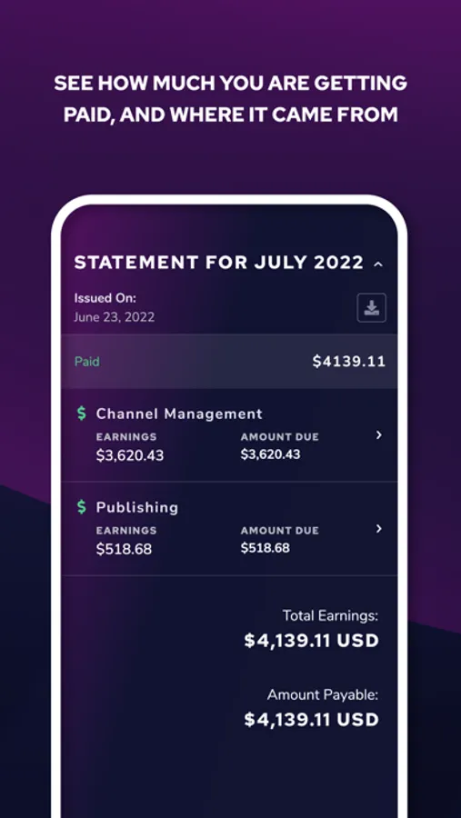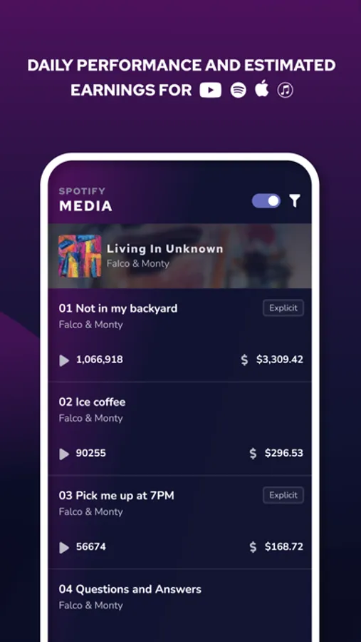 - Daily performance and estimated earnings for YouTube, Spotify, Apple Music and iTunes