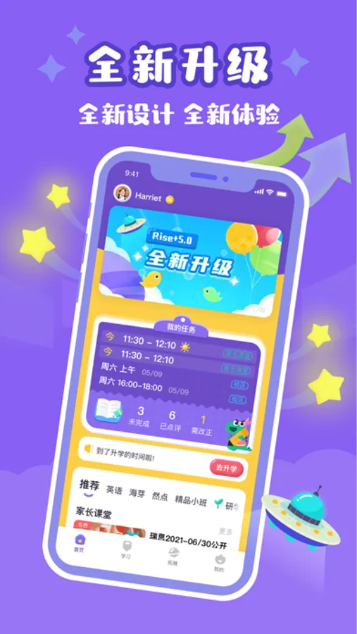 手机Rise+家长端是瑞思教育为所有学生家长提供的一个综合平台。在这里,学生能完成生动活泼的家辅任务,学习多样化的课外资源。家长可以查看孩子在瑞思课堂的精彩瞬间,可以与老师语音沟通,监督孩子的课堂学习,协助孩子完成各项家辅任务,查看家辅报告。