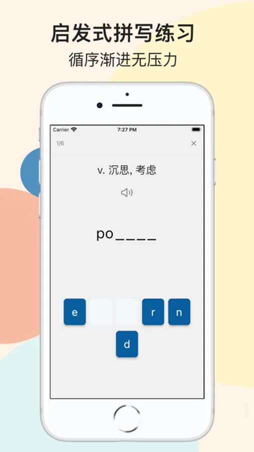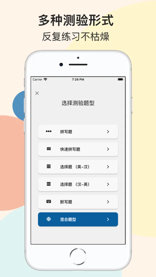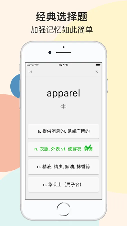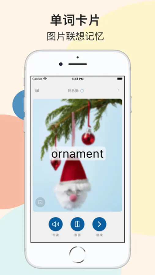 单词卡片,图片辅助记忆。多种测验题型,“选择题”、“问答题”、“拼写题”,可根据熟悉程度,自行选择测验方式,360度记忆神经刺激,事半功倍。