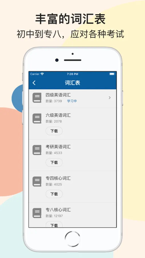 英语四级、六级、考研、专四、专八、托福TOEFL、雅思、GRE、SAT、GMAT、中考、高考、商务英语等多种词汇表,可自由选择学习。