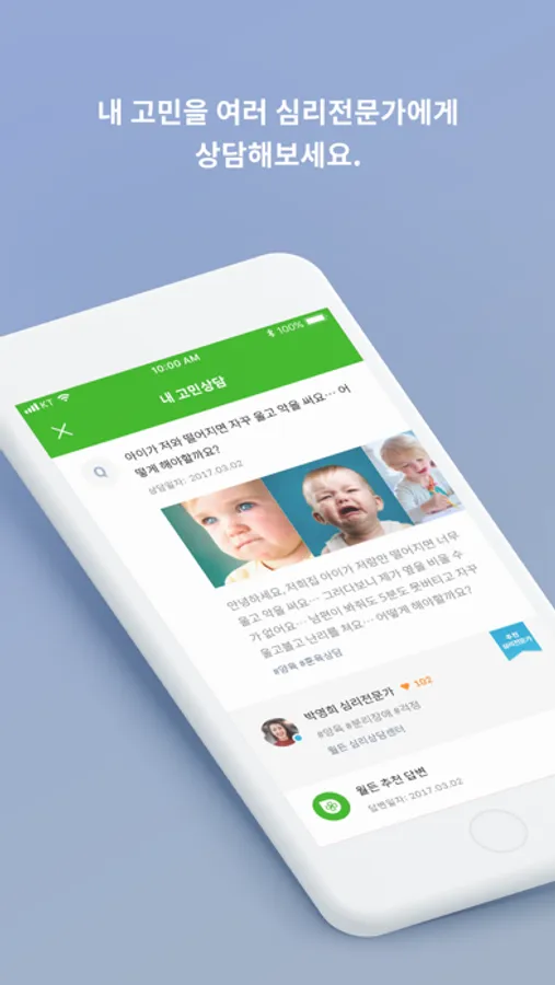 여러 상담사에게 익명으로 공개 상담 문의를 남길 수 있어요. 공개 상담은 상담의 진료 카테고리에 따라 해당 카테고리를 전문으로 진료하는 상담사들에게 전달되어, 다양한 상담사에게 상세한 답변을 받아볼 수 있습니다.