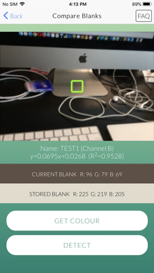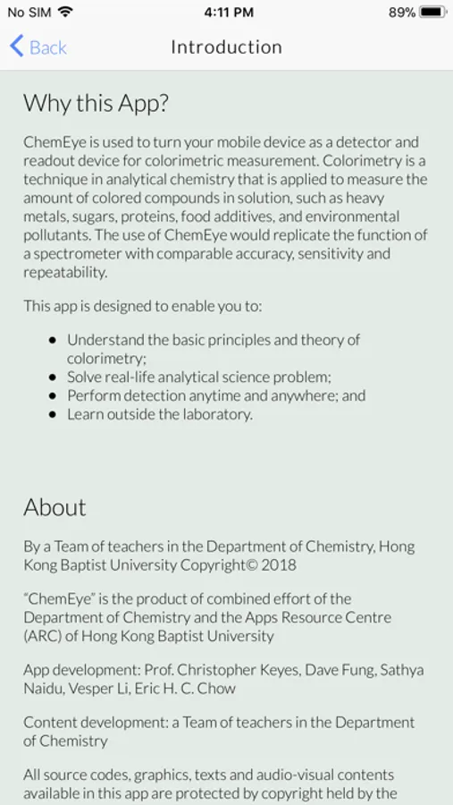 ChemEye is used to turn your mobile device as a detector and readout device for colorimetric measurement. Colorimetry is a technique in analytical chemistry that is applied to measure the amount of colored compounds in solution, such as heavy metals, sugars, proteins, food additives, and environmental pollutants. The use of ChemEye would replicate the function of a spectrometer with comparable accuracy, sensitivity and repeatability.