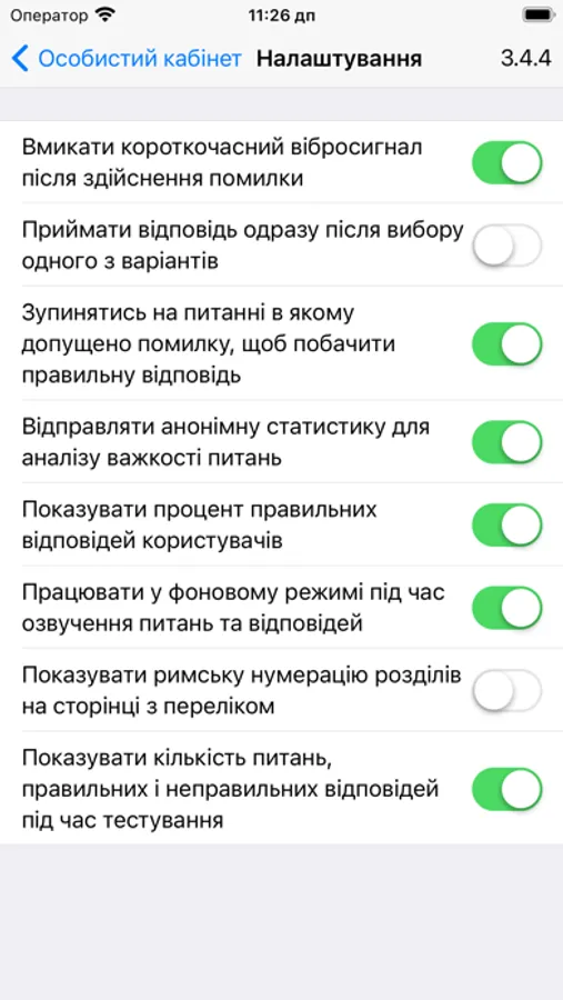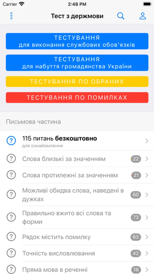 - Тестування по питанняx будь-яких обраних розділів: підряд, випадково або за важкістю (визначається за статистикою проходження тестів усіма користувачами додатку);