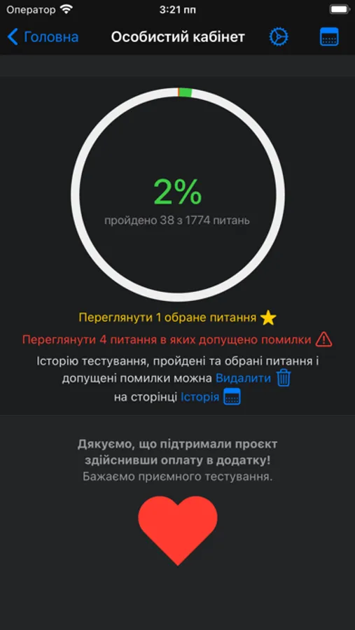 - Можливість додавання питань в "обрані" та проходження по них окремого тестування;