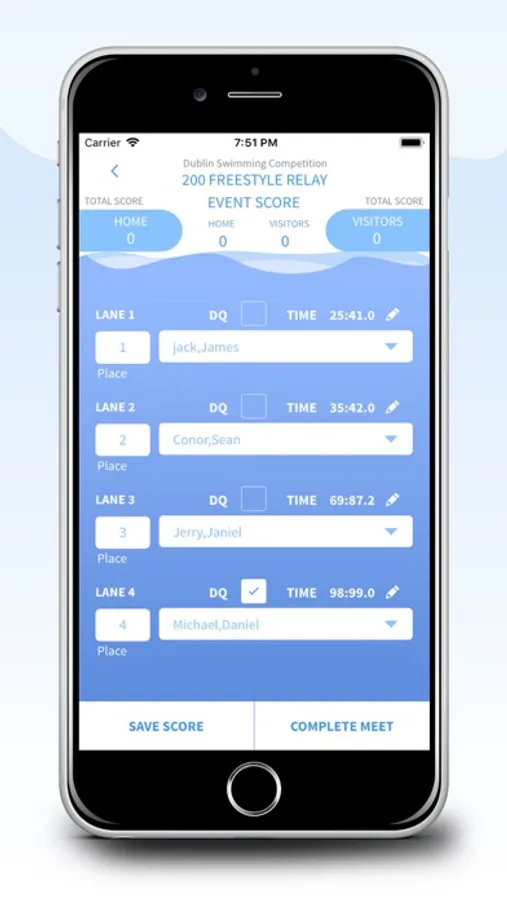 Paperless way to score high school swim meets. No prior experience with written score sheets required with this app. Any team helper can do it. No math skills required. Just complete the requested data fields prior to the meet, then enter the results in the scoring section of the app during the meet. Keeps score of each individual event and the total score at the same time. Email results via a CSV file and includes a signature pad for the referee’s signature. Archived meet stays on app for reference if needed. Incorporates NFHS scoring rules.